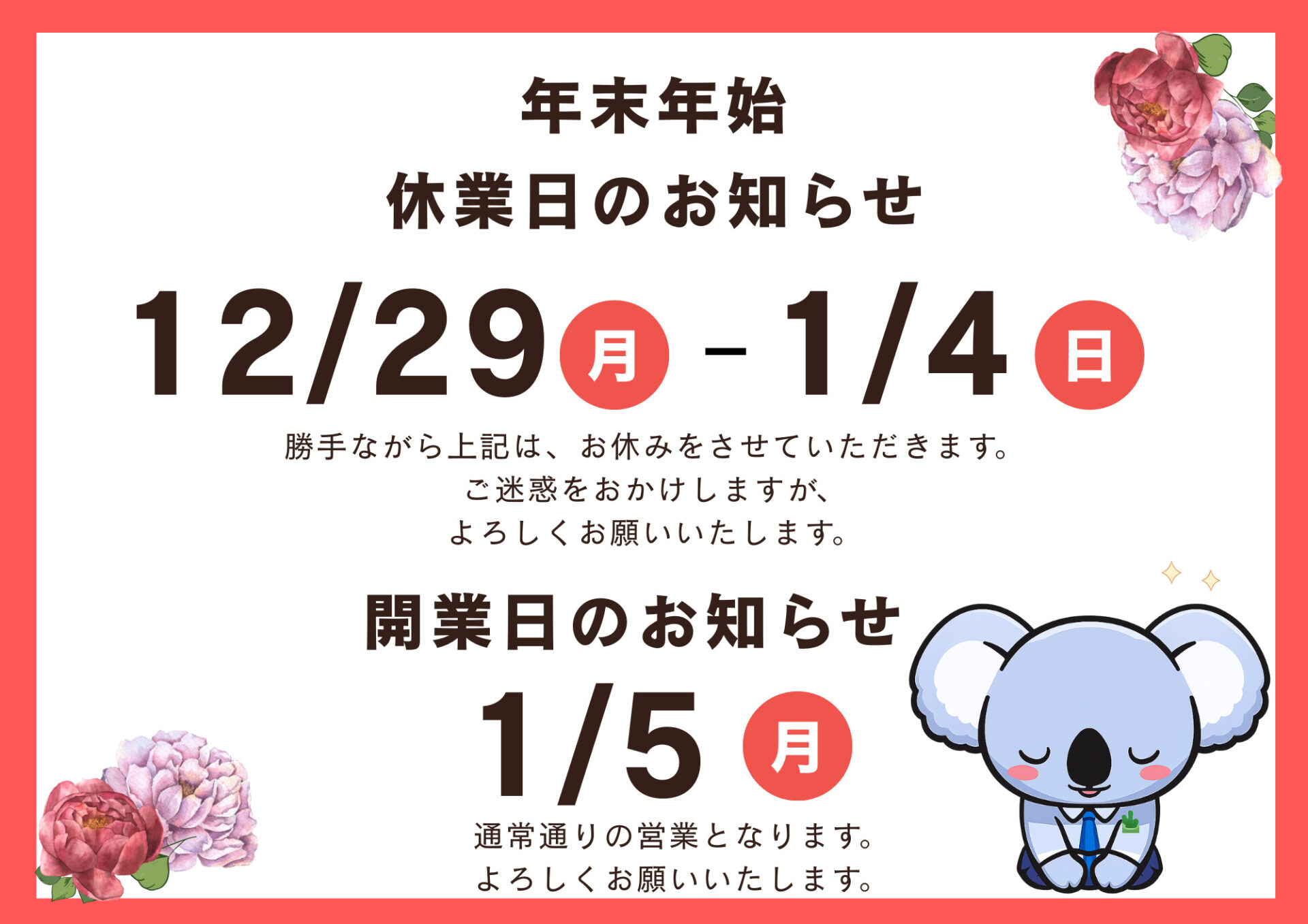 年末年始の休業日・年始の営業開始について